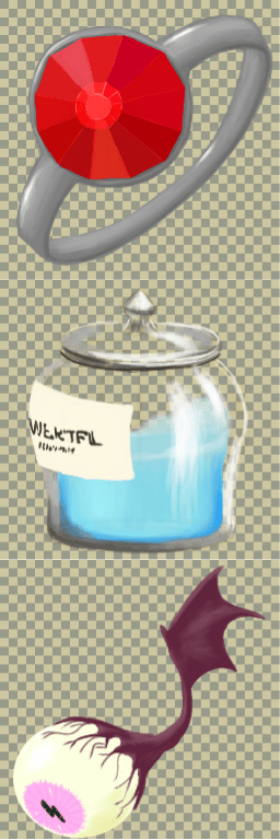 Two different assignments using digital paint. The three objects are images for hypothetical items in a video game, so they are meant to be viewed at a smaller size.